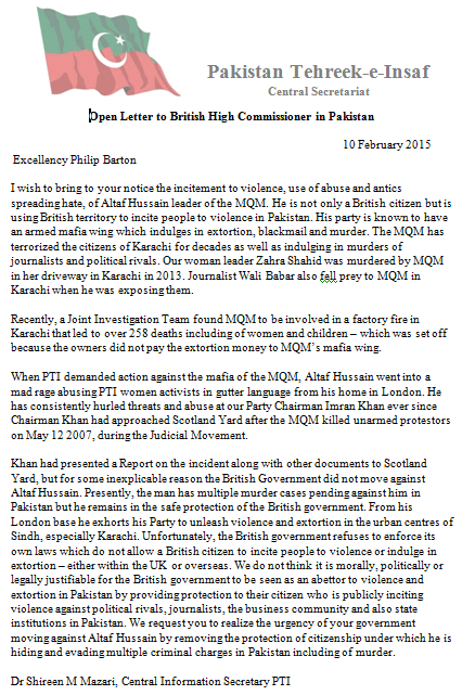 The letter addressed to Phillip Barton levels accusations against Altaf Hussain and calls upon the British government to take action against him.