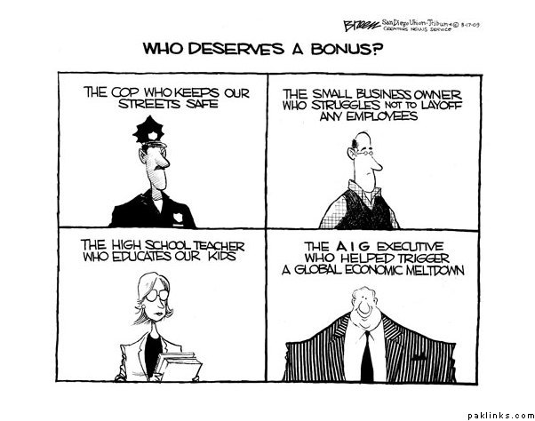 quite frankly I think this whole thing has blown out of proportion. Bankers deserve bonuses. Yes the average toilet cleaner at a bank must work hard to earn more money but guess what the average banker has atleast a bachelors degree usually from a good university, have Been working hard at their job for a long time. Have much more responsibility, their job carries more risk, they are the ones earning the actual money for their bank, and hence get rewarded. Furthermore, only $165mm out of the $173bn AIG has received as bailout is going towards the bonuses.