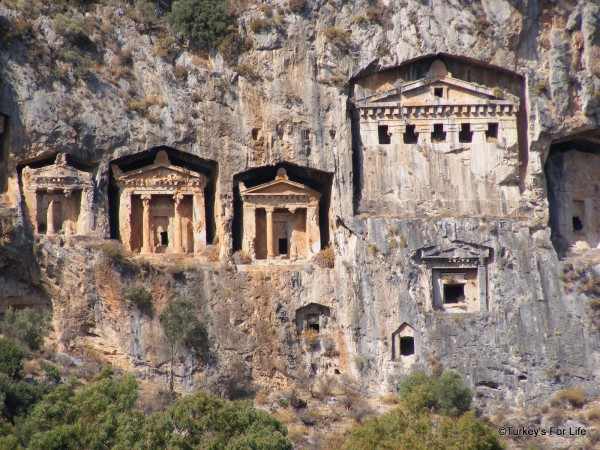 The Lycian tombs near Dalyan in Turkey are a series of tombs carved out of a cliff face. They were built by the Lycian people (allies of the Trojans during the Trojan war) who were generally passed from conqueror to conqueror through history until the majority (Greek speakers) were forced to leave Turkey and move to Greece after the Greco-Turkish war in a population exchange. The ruins of the ancient trading city Kaunos are nearby so it is worth a visit.