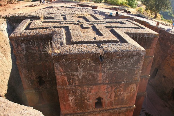 Lalibela is a town in Northeast Ethiopia famous for its wonderful rock carved churches. It is considered to be one of the holiest sites in Ethiopa. The layout of the churches are considered to be representative of Jerusalem (it is a Christian region). This helps date the sculptures to the 12th century AD. There are thirteen churches in all and another interesting factor of the site is that it exploits an artesian geological system to fill wells near each church.