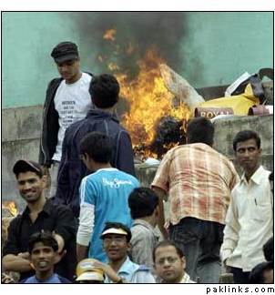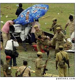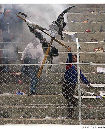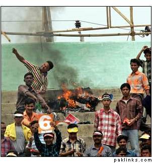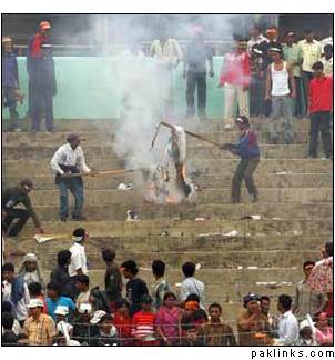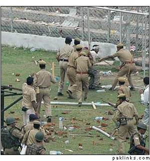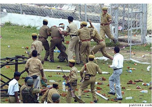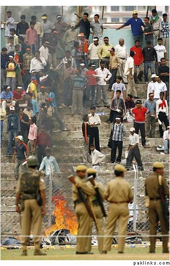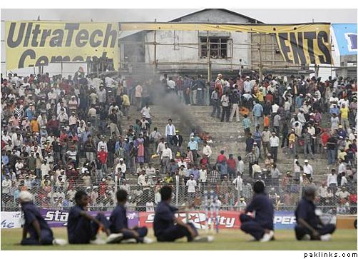 “Announcements were being made from time to time on the public address system in Assamese, so the crowd was being kept updated about the situation,” Bikash Baruah, honorary secretary of the Assam Cricket Association, said soon after the match was called off. The fans, however, grew restless, and gave vent to their steadily increasing anger, first by throwing water bottles onto the field and burning scraps torn from advertising hoardings, newspapers and placards. When they ran out of bottles they improvised, breaking down wooden advertising panels and uprooting bamboo poles used for scaffoldings. They then proceeded to attack the short walls that hold the fencing, prying loose bricks and further breaking these down to hurl into the field of play.
