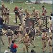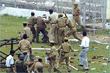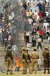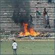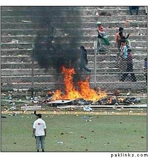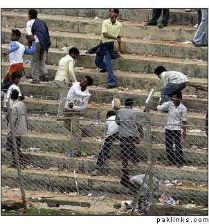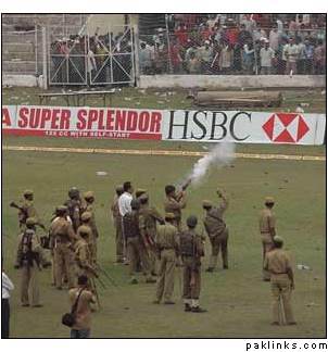 The crowd lit bonfires, piling on whatever flammable material they could find, and began to throw these lit items over the fence. While all this was happening, the police made brief forays towards the stands causing trouble but retreated swiftly when pelted with missiles. Some policemen were even taking cover behind the sightscreen, using an advertising hoarding as a shield to protect themselves.