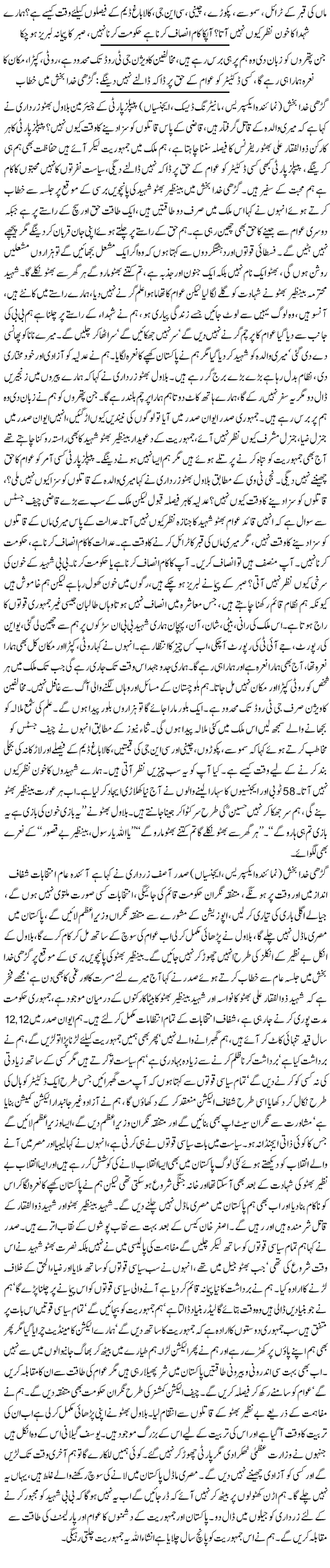**While lashing out at the Supreme Court, Bilawal criticized Chief Justice of Pakistan Iftikhar Muhammad Chaudhry is misusing his powers and authority. Main job of the court is to deliver justice but chief justice is not doing his job well. “Shaheed Benazir was gunned down mercilessly and ruthlessly on the roads and Chief Justice is concerned about CNG, sugar price and Kalabagh Dam issues. **