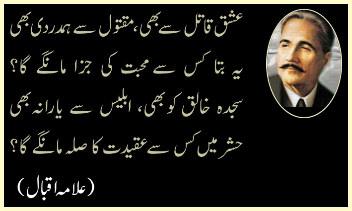 **عشق قاتل سے بھی، مقتول سے ہمدردی بھی یہ بتا کس سے محبت کی جزا مانگے گا؟ سجدہ خالق کو بھی، ابلیس سے یارانہ بھی حشر میں کس سے عقیدت کا صلہ مانگے گا؟ (علامہ اقبال) **