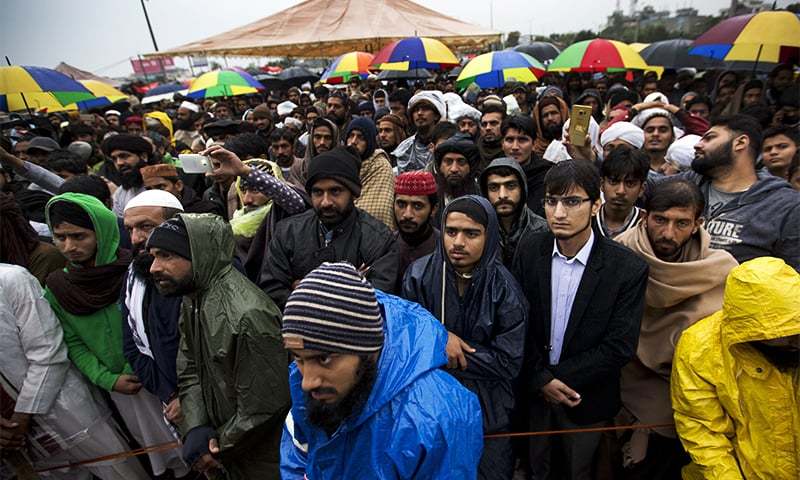 Supporters of religious parties listen to their leaders during a sit-in protest in Islamabad. ─ AP
