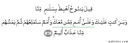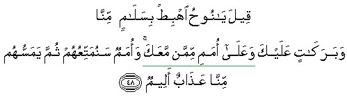 It was said: O Nuh! descend with peace from Us and blessings on you and on the people from among those who are with you, and there shall be nations whom We will afford provisions, then a painful punishment from Us shall afflict them.