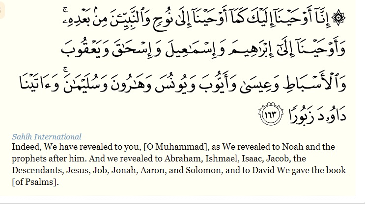 إِنَّا أَوْحَيْنَا إِلَيْكَ كَمَا أَوْحَيْنَا إِلَىٰ نُوحٍ وَالنَّبِيِّينَ مِن بَعْدِهِ ۚ وَأَوْحَيْنَا إِلَىٰ إِبْرَاهِيمَ وَإِسْمَاعِيلَ وَإِسْحَاقَ وَيَعْقُوبَ وَالْأَسْبَاطِ وَعِيسَىٰ وَأَيُّوبَ وَيُونُسَ وَهَارُونَ وَسُلَيْمَانَ ۚ وَآتَيْنَا دَاوُودَ زَبُورًا ﴿١٦٣﴾