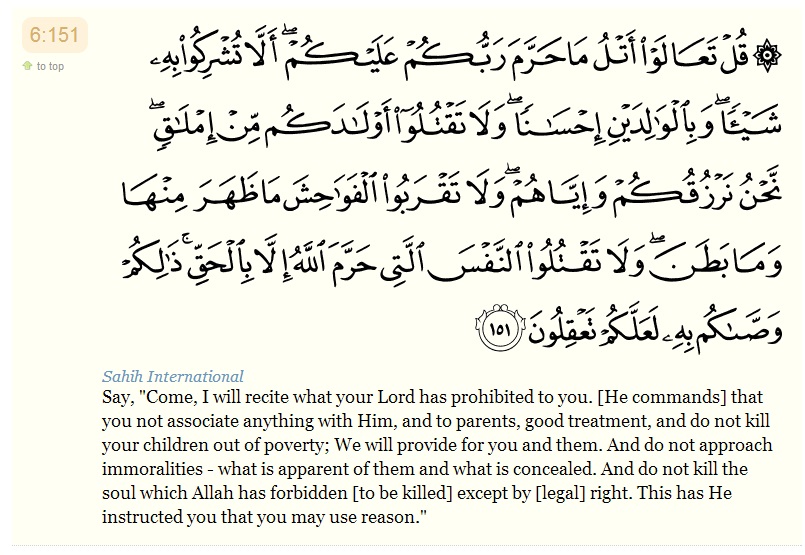 Say, “Come, I will recite what your Lord has prohibited to you. [He commands] that you not associate anything with Him, and to parents, good treatment, and do not kill your children out of poverty; We will provide for you and them. And do not approach immoralities - what is apparent of them and what is concealed. And do not kill the soul which Allah has forbidden [to be killed] except by [legal] right. This has He instructed you that you may use reason.”