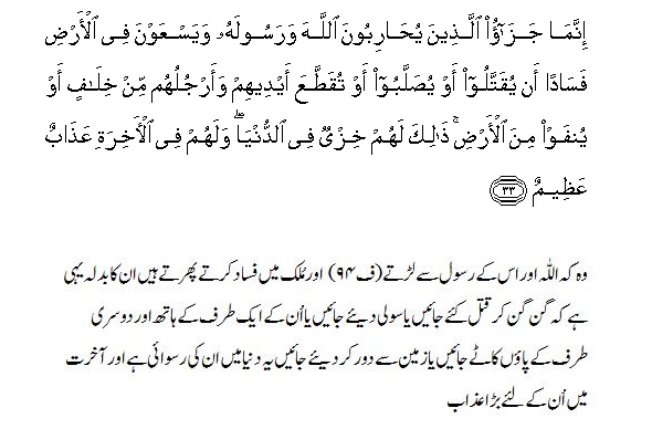 jo loog allah or is ke rasol ke mukhalfat kertey hain or zameen mae fasaad machatey hain un logun ko qatal kiya jaye yahan pey word “yuqatalu” istemaal hua hai matlab un ke tukrey kiye jayen , ya un ke hath or paun kaat diye jayein(ek hath or ek paun kaat dia jaye) ya unhey zameen se dour ker dia jaye .. ye tu hai un keliye duniya ke zindagi me ruswayi or akhirat mae un ke liye mazeet bohut bara azaab hai