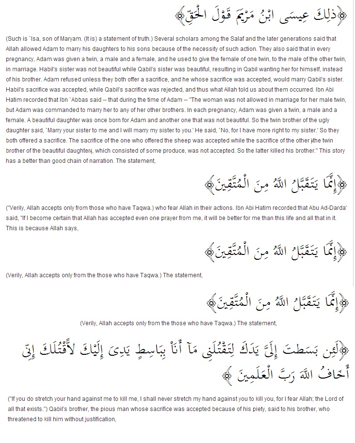 "So they both offered a sacrifice. The sacrifice of the one who offered the sheep was accepted while the sacrifice of the other ﴿the twin brother of the beautiful daughter﴾, which consisted of some produce, was not accepted. So the latter killed his brother.‘’