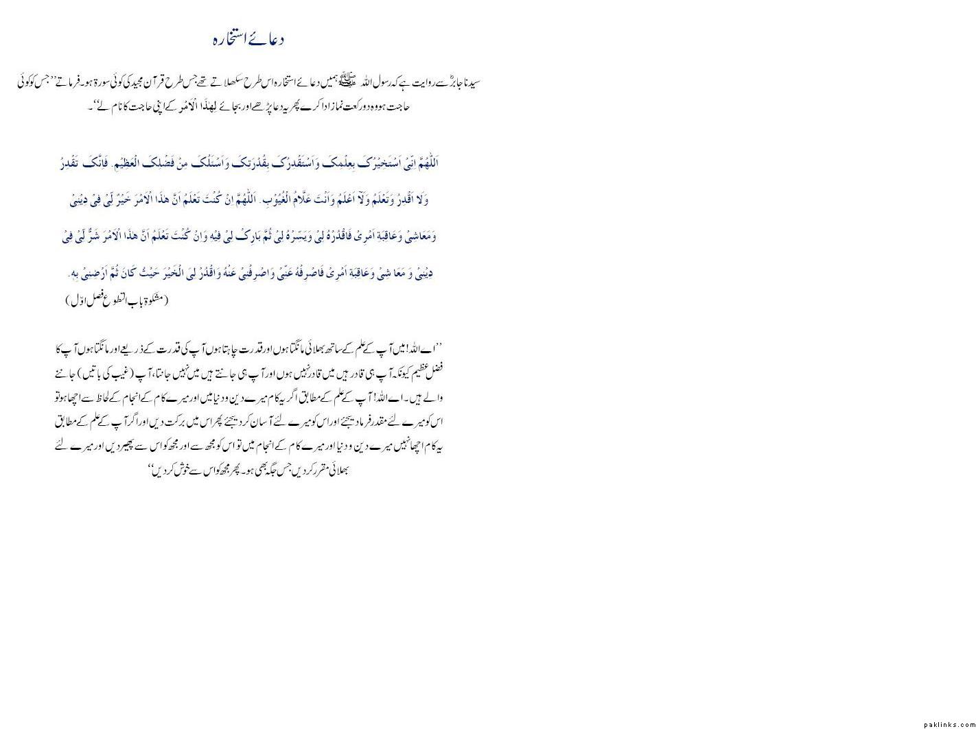 TRANSLATION: “O Allah! I seek goodness from Your Knowledge and with Your Power (and Might) I seek strength, and I ask from You Your Great Blessings, because You have the Power and I do not have the power. You Know everything and I do not know, and You have knowledge of the unseen. Oh Allah! If in Your Knowledge this action ------------------------------------------------ (which I intend to do) is better for my religion and faith, for my life and end [death], for here [in this world] and the hereafter then make it destined for me and make it easy for me and then add blessings [baraka’] in it, for me. O Allah! In Your Knowledge if this action is bad for me, bad for my religion and faith, for my life and end [death], for here [in this world] and the hereafter then turn it away from me and turn me away from it and whatever is better for me, ordain [destine] that for me and then make me satisfied with it.”