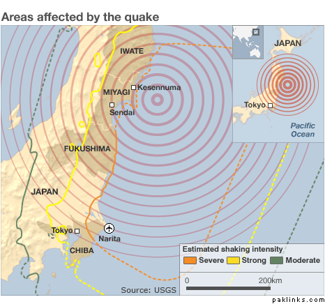 The tsunami was triggered by the most powerful earthquake to hit Japan since records began. The tremor, measured at 8.9 by the US Geological Survey, hit at 1446 local time (0546 GMT) at a depth of about 24km.The impact has been devastating, with cars, ships and buildings swept away by a wall of water.