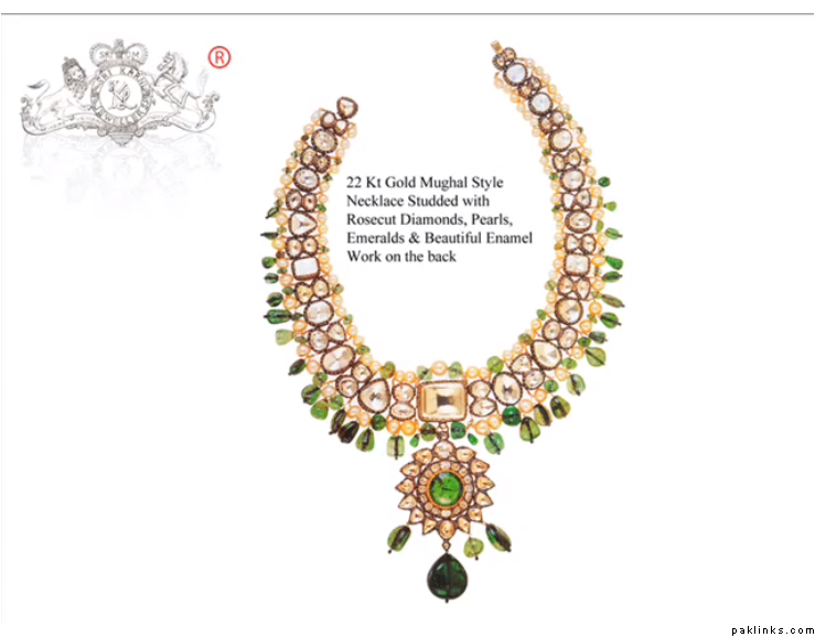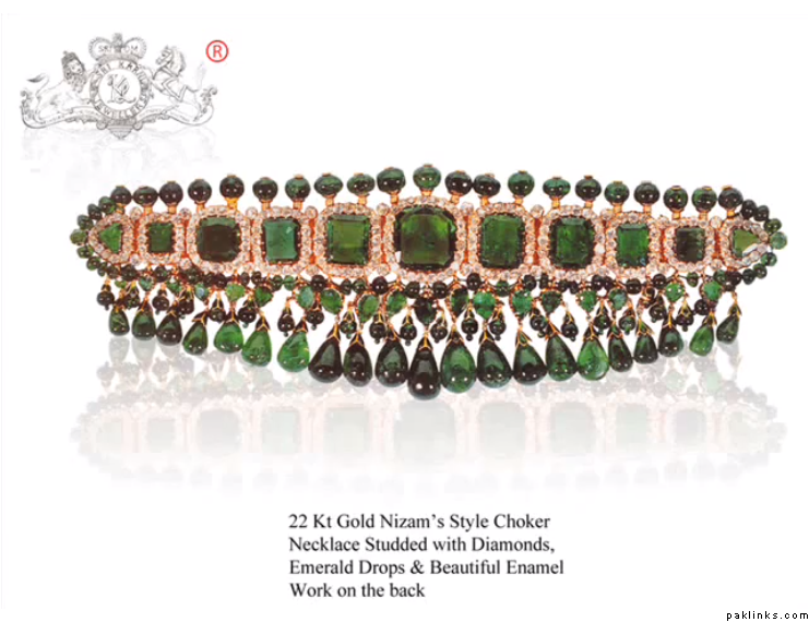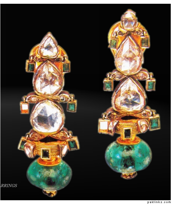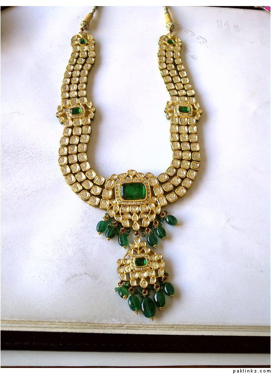 Saniya Maskatiya's wedding jewlery was beautiful as wel--with a gold/cream gharara and the emerald diamond polki set.