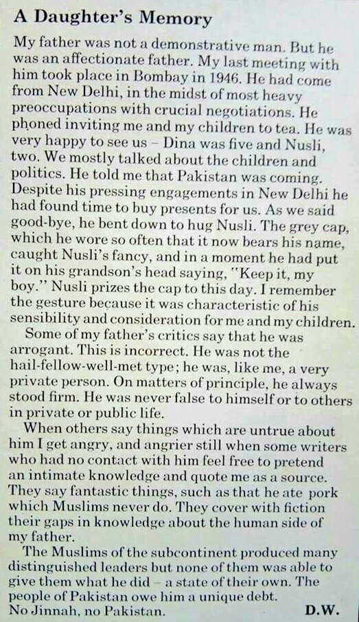 Wrong conclusion made. Even though the thoughts are good. Quaid e Azam made Pakistan because he didn’t think Hindus can be trusted to be secular enough. He himself was a liberal educated and open minded person. Thus the marriage to a non Muslim. Thus the daughter who was not forced to be Muslim. What Quaid e Azam got wrong was the Mullah mindset Pakistan generated is even more dangerous than the untrustworthy Hindu. He would be abhored to Look at the sad state of affairs of Pakistan today. A mosque in every corner producing religious bigots by thousands. Rest In Peace Dina.
