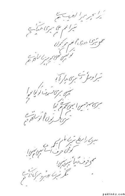 **shukran shukran…ab maiN tumko ek tarz-e-taHreer shikast dast kashiid] dikhaataa huN…aajkal ke zamaane ke log to paRh bhii nahiiN sakte…maiN is liye paRh letaa huN kiuN k mere vaalid hamesha apne haath se mujhe Khat likhaa karte the jo aisii hii taHreer huaa kartii thii ![]()