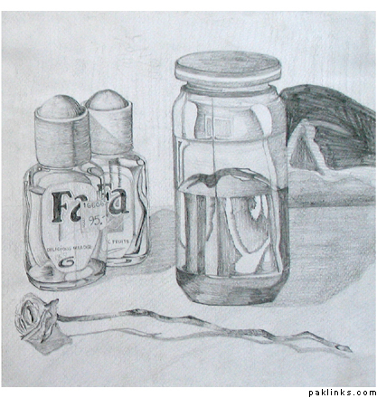 it's a still-life ... done in pencil ... :) ... or are you asking about the last painting? that is also a still life done in sections ...