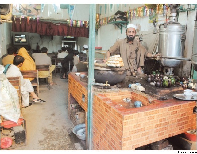 “The hotel owner usually switches off the TV when we are done with our cup of tea,” says Ghulam Ali, a customer of another tea shop, while smoking charas and enjoying an Indian movie. “So we have to purchase another cup in order to continue watching our programme or movie.” These small tea shops have two or more TV sets with different programmes being played simultaneoulsy in order to cater to everyone’s needs.