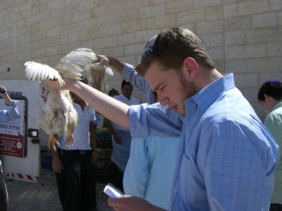 Kapparot is a Jewish ritual practiced by some Jews on the eve of Yom Kippur. The person swings a live chicken or a bundle of coins over one’s head three times, symbolically transferring one’s sins to the chicken or coins. The chicken is then slaughtered and donated to the poor for consumption at the pre-fast meal.