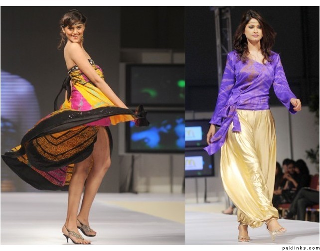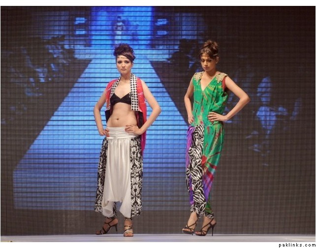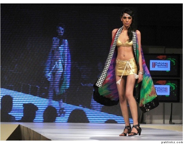 Ok. This time I think Karachi Fashion Week should have been re-named skimpy-trashy fashion week…before you attack be for being too conservative, I just wonder is this what we mean by having progress in our fashion industry? I’ve seen that Pakistani fashion shows have become more daring but this is a tad too much. I can’t see any beauty in these clothes at all…looks so cheap.TWhat’s your take?