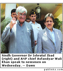 Asfandyar Wali said that according to Pakhtoon traditions, he was thankful to the governor because he had visited for condolence. He said that the Loya Jirga had called for a shutter-down strike and lawyers and political parties including the ANP have announced their support for it. Salahuddin Haider, Advisor to the Chief Minister on Information, Chief Secretary Sindh Shakil Durrani, Secretary Local Government Fazal ur Rehman and District Coordination Officer Karachi Javed Hanif and Capital City Police Officer accompanied the governor. Then, the governor visited MQM headquarters ‘Nine Zero’ where the party’s Rabita Committee Deputy Convenors Dr Farooq Sattar and Shaikh Liaquat, Incharge Anwar Alam and Joint Incharge Abdul Haseeb received him. He offered Fateha for the departed souls of the MQM’s workers killed on May 12. The governor also visited the deputy chief of the Jamaat-e-Islami, Ghafoor Ahmed, at his residence where Ahmed gave him proposals for peace and sanity in Karachi. The governor assured him that the government would ponder upon these proposals. Ibad said that peace-loving citizens were deeply grieved over the May 12 killings. He urged all the people of Karachi to join hands for unity and cohesion and shun the politics of hatred and bias. “My visits are aimed at condolence and it should not be politicised,” he stressed. He said that Altaf Hussain and Pakhtoon veteran Bacha Khan believed in non-violence and they and the party leaders and their supporters would not be involved in violence anywhere. He also called upon the Pakhtoon to play their due role to foil the conspiracy that is aimed at pitting Karachi’ites against each other.