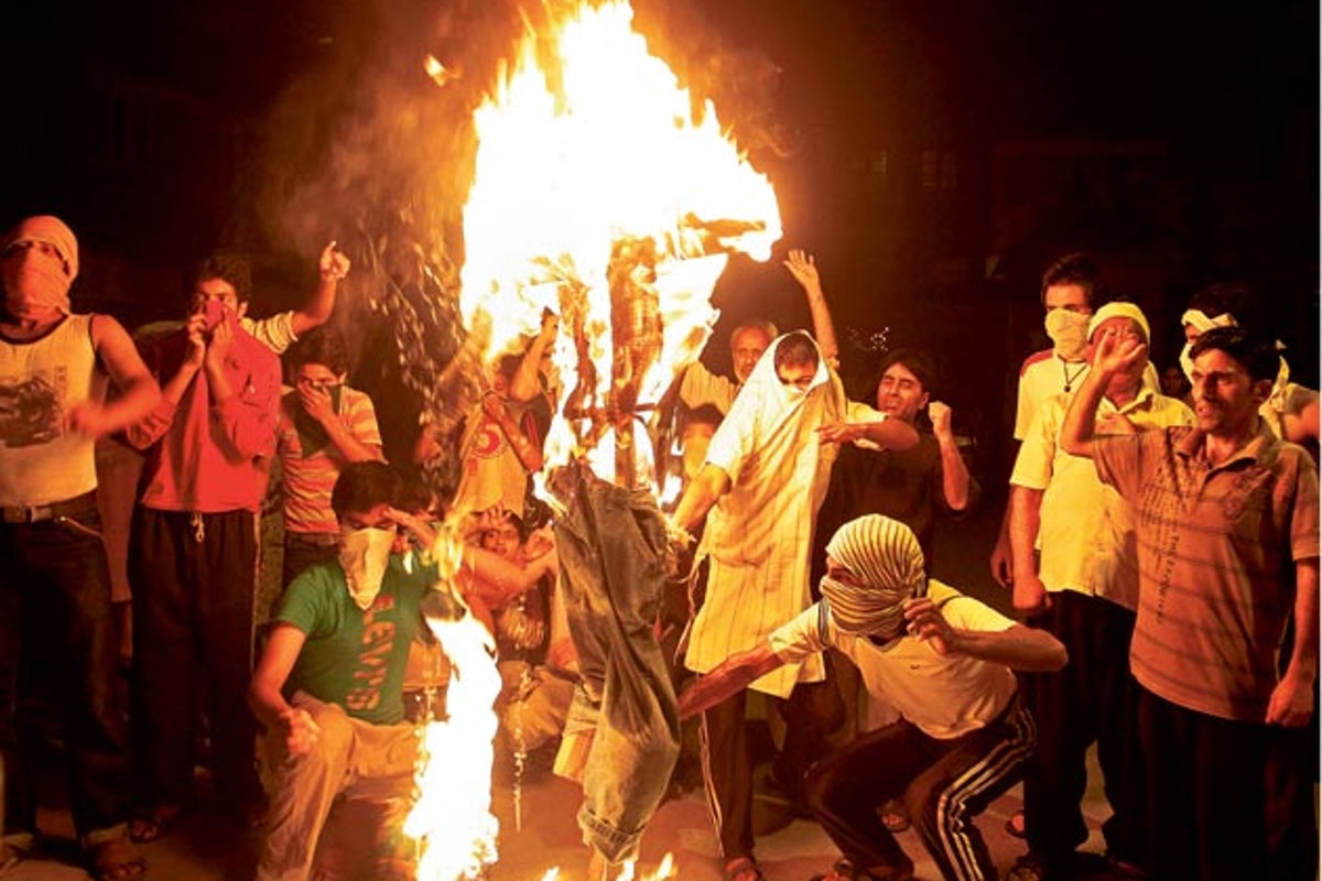 Srinagar residents burn an effigy of Omar Abdullah, the Chief Minister of Jammu and Kashmir