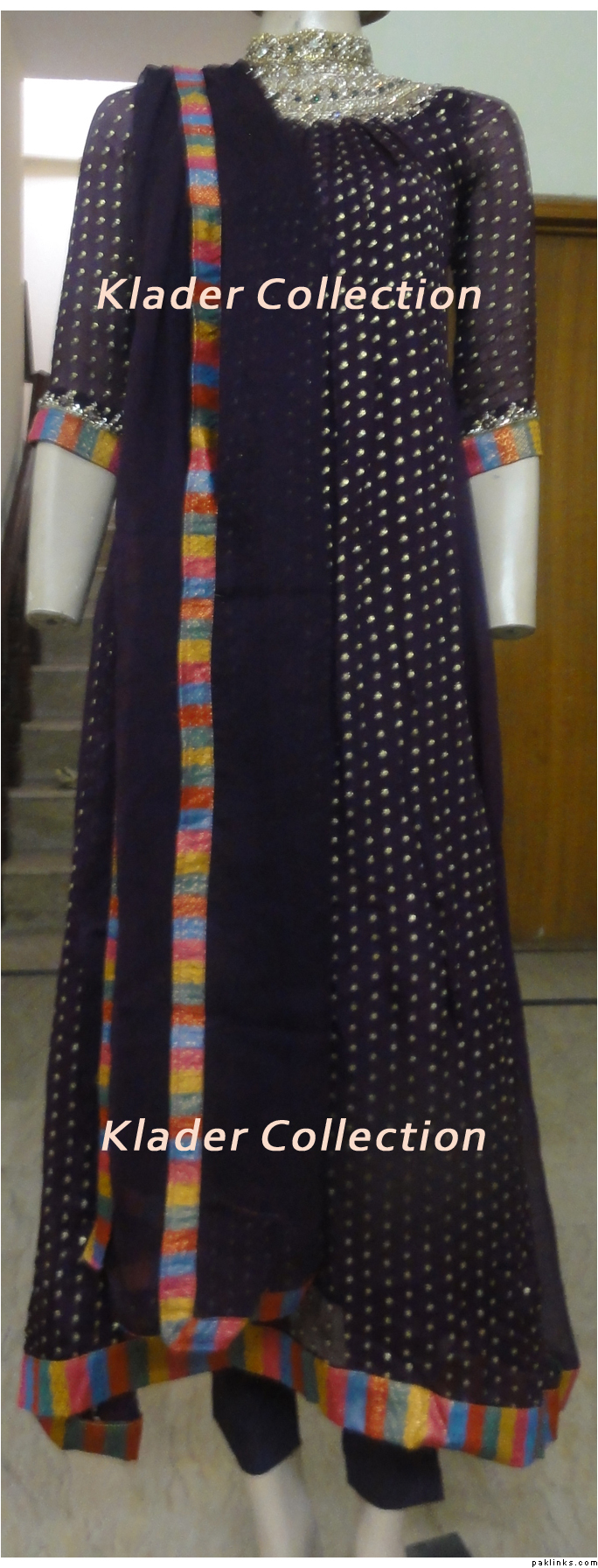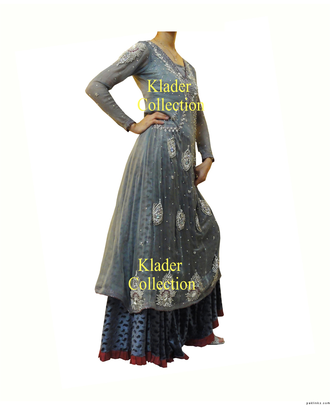 The front gala is made of stones and a bit of dubka, the back motif is made of dubka, Stones, Sequines, Beads and Pitta work. Inner gown is sleeveless.
