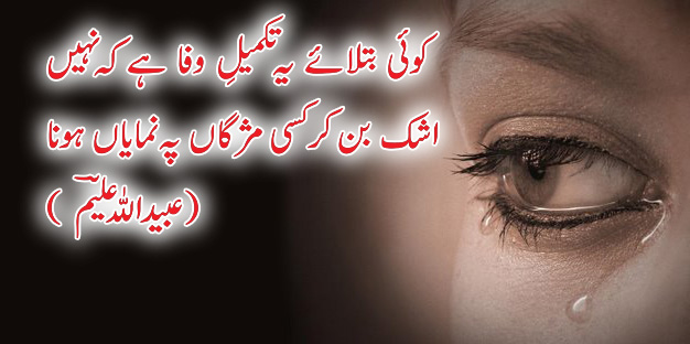 کوئی بتلائے یہ تکمیلِ وفا ہے کہ نہیں اشک بن کر کسی مژگاں پہ نمایاں ہونا (عبید اللہ علیم)