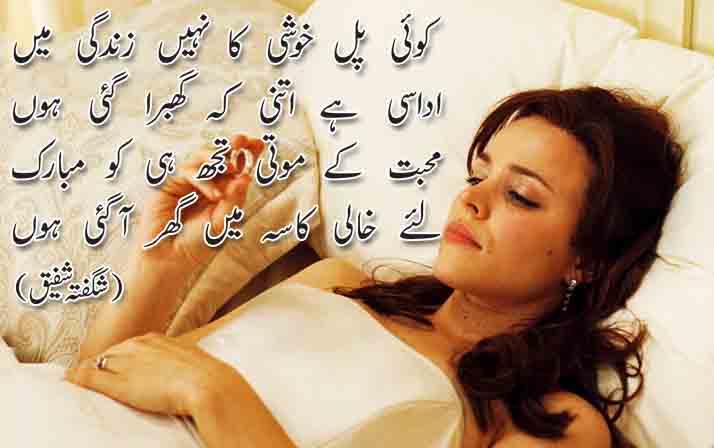 کوئی پل خوشی کا نہیں زندگی میں اداسی ہے اتنی کہ گھبرا گئی ہوں محبت کے موتی تجھ ہی کو مبارک لئے خالی کاسہ میں گھر آگئی ہوں (شگفتہ شفیق)