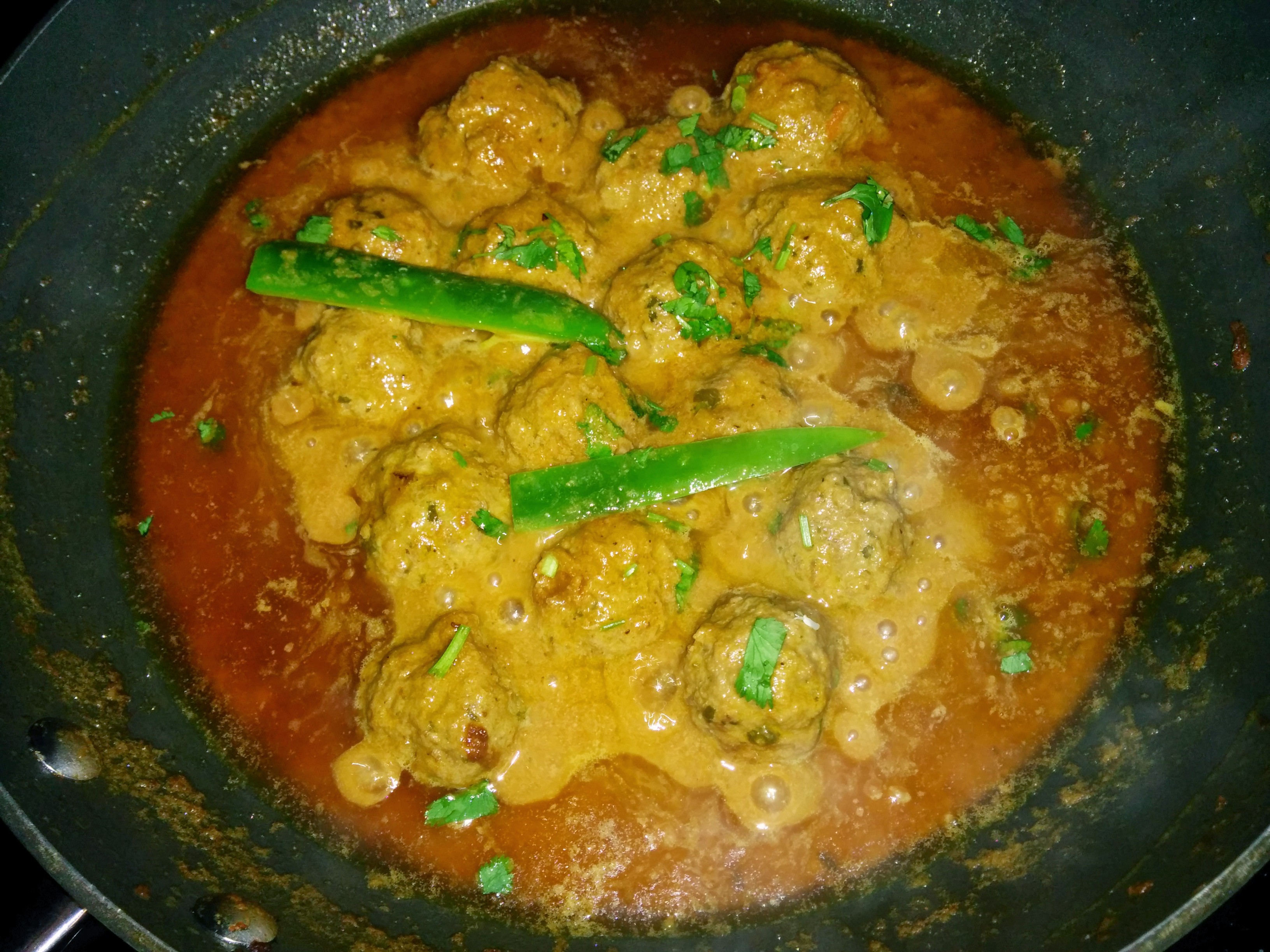 Fry onions. add tomatoes, ginger and garlic paste. let the tomatoes get soft on medium low heat. Leave the oil in the pan, put the fry onions, tomatoes, and yogurt in the chopper and pulse it few times. Return this mixture back to the pot. Add the dry spices. Let it simmer for few minutes. add almost 3/4 cup of water. Make balls and add them to the gravy. Cover with lid and let them do their magic for a good 15-20 minutes on medium low heat. after around 20 minutes, you can very carefully turn the koftas. Let them cook for another 10 minutes or so. Sprinkle cilantro and green pepper. Leave on low heat for dum for about 5 minutes or so.