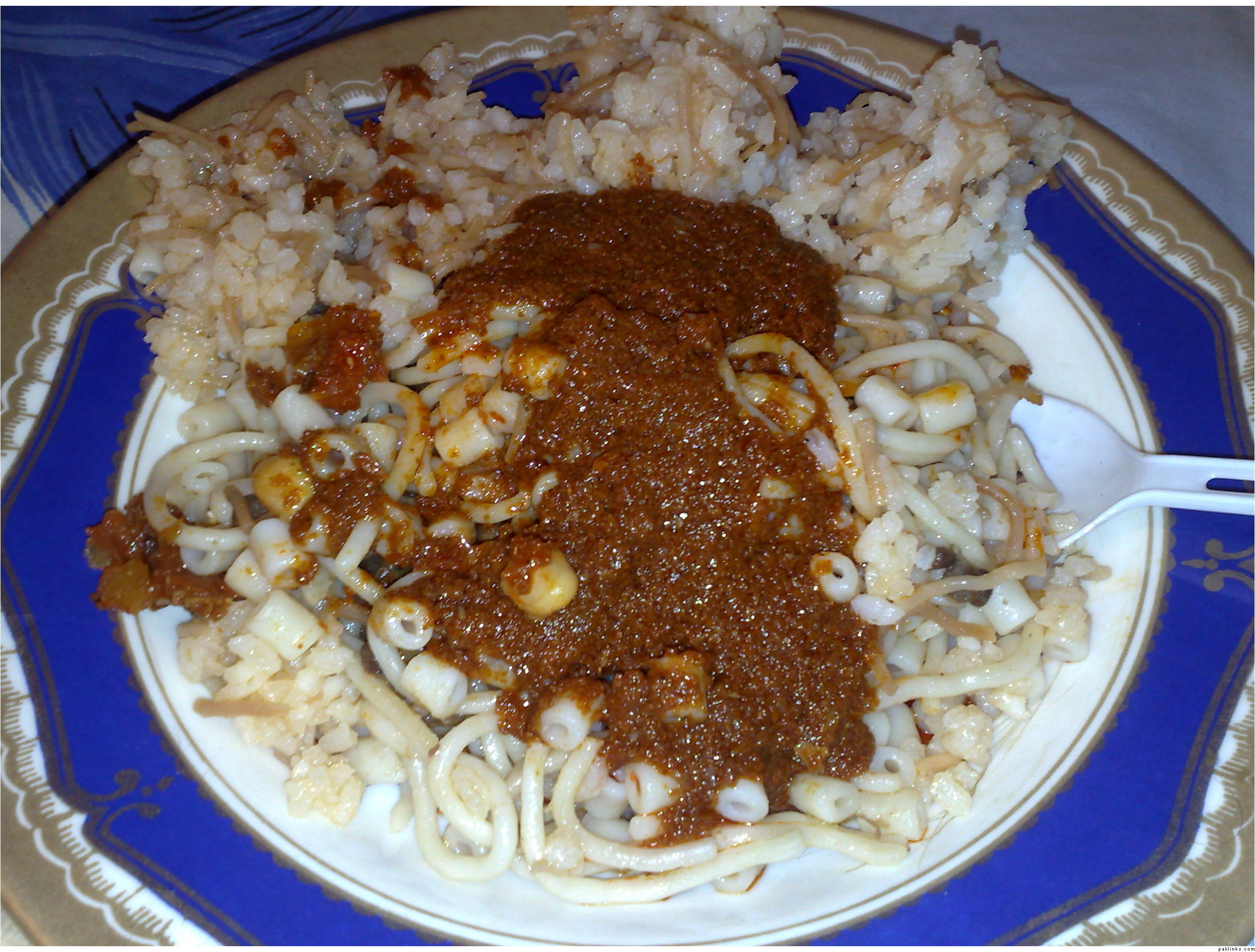 yeh kushari i dunt like either .. but its only pasta, daal, chaney, and sauce .. i have a habbit of checking food atleast once .