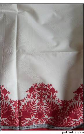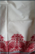 The white shirt front piece is fully embroidered, and the pants are printed (red, black, and white print on white fabric).