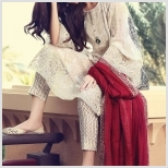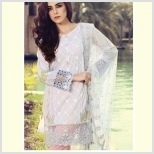 The white fabric for the back is pasteprinted but very see through, and I hardly wear slips as I feel. Wry hot in summers. Also the trousers are very see through. Apart from that I love the suits, it’s gorgeous! It breaks my heart to be not wearing it other then that I ordered the black net with white emb, the emb is amazing