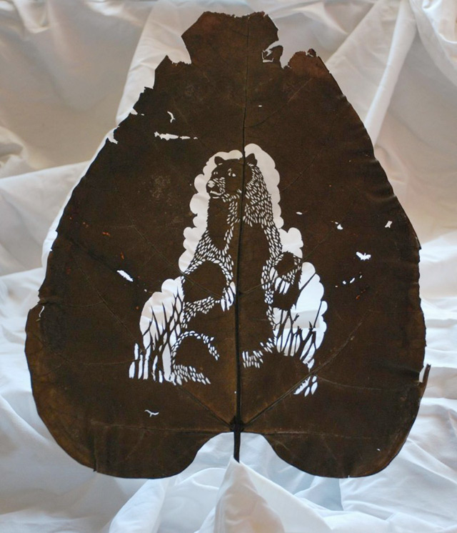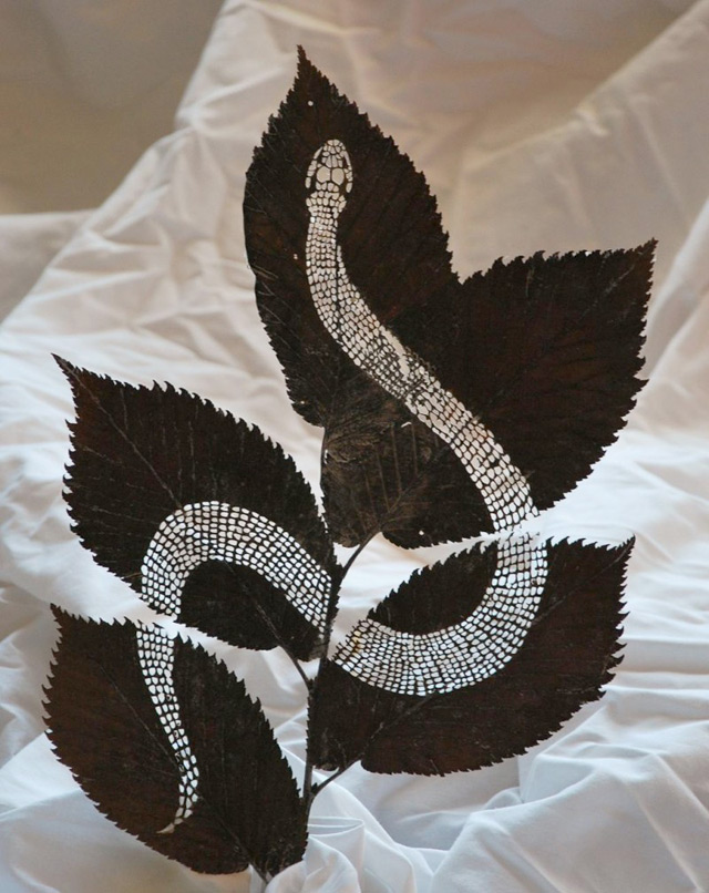 Artist Lorenzo Durán lives and works in Guadalajara, Spain where for the last four years he’s focused primarily on cutting intricate illustrations from dried leaves. He often depicts animals and insects as shown above, but has explored a wide variety of geometric patterns and also does custom work on request.
