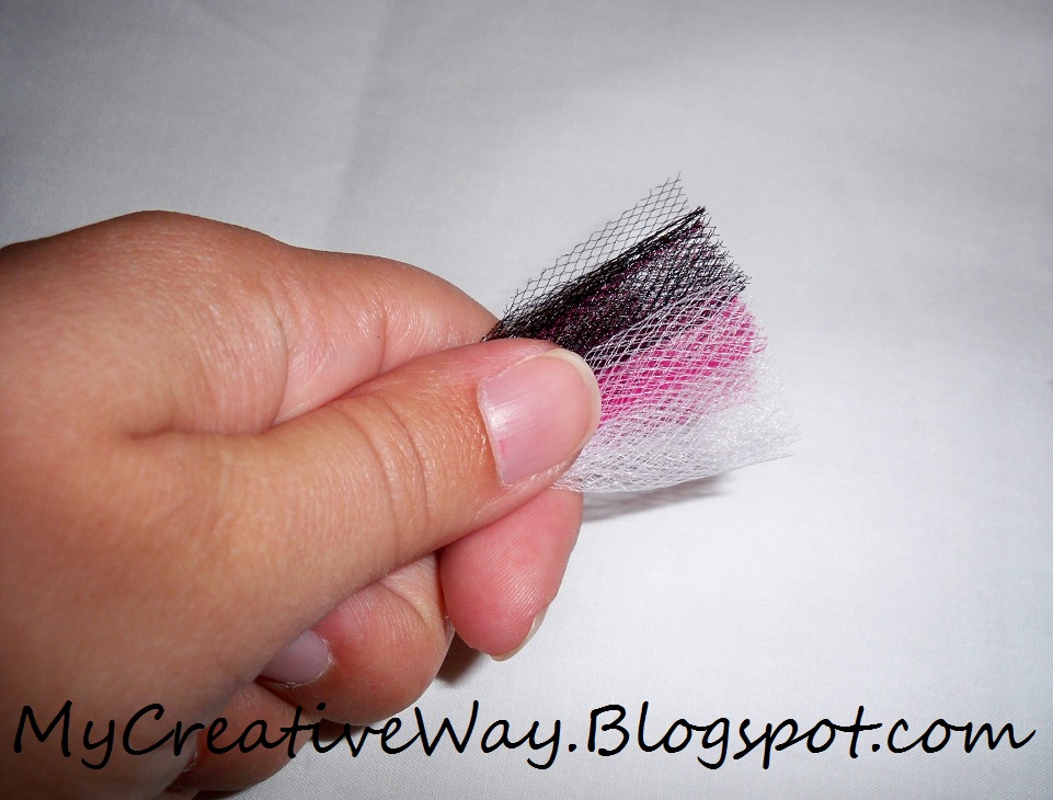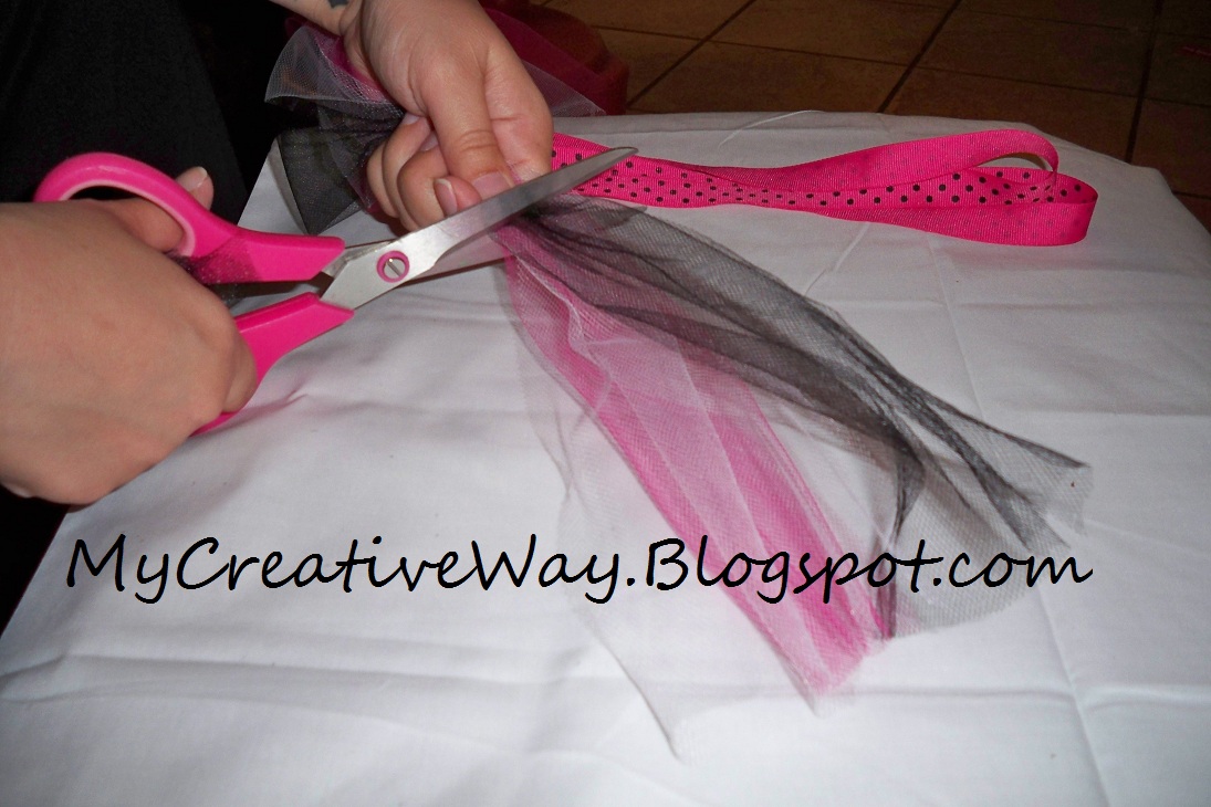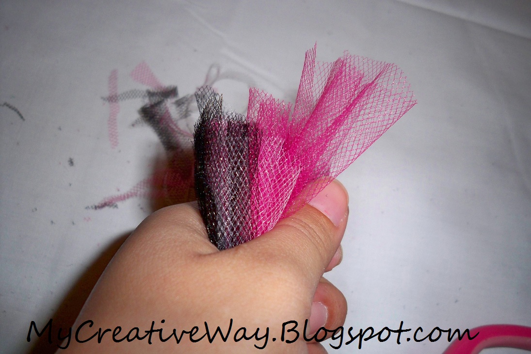 Cut each strand of tulle 8" long. If you cut them in threes it takes less time then cutting them one by one.