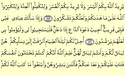 Ramadhan is the (month) in which was sent down the Qur’an, as a guide to mankind, also clear (Signs) for guidance and judgment (Between right and wrong). So every one of you who is present (at his home) during that month should spend it in fasting, but if any one is ill, or on a journey, the prescribed period (Should be made up) by days later. Allah intends every facility for you; He does not want to put to difficulties. (He wants you) to complete the prescribed period, and to glorify Him in that He has guided you; and perchance ye shall be grateful. (2: 185) (Al-Baqarah)