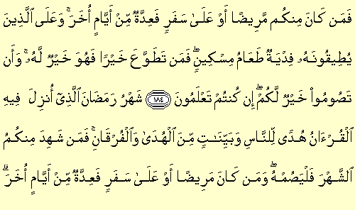 (Fasting) for a fixed number of days; but if any of you is ill, or on a journey, the prescribed number (Should be made up) from days later. For those who can do it (With hardship), is a ransom, the feeding of one that is indigent. But he that will give more, of his own free will,- it is better for him. And it is better for you that ye fast, if ye only knew. (2: 184) (Al-Baqarah)**