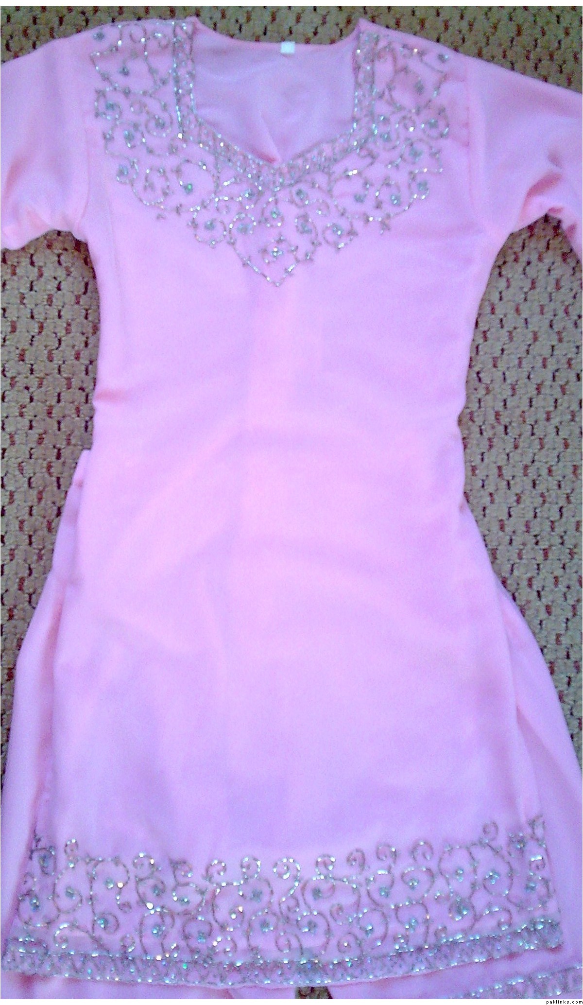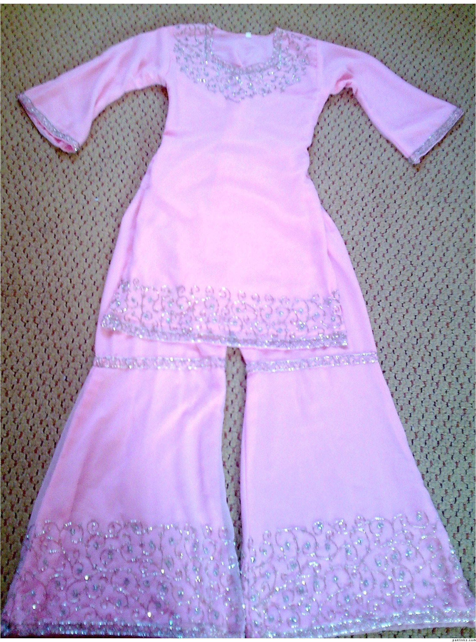 ok well i think it is a sharaara because it has a simple embroidery border by the knees (or is it called gota or something??) It was brought awile back and even though i really like it i wouldn’t wear it because of the arms. They are flury don’t know the proper word for it 3/4 length and i would prefer them long and fitted. Its something that i think would look nice on an engagement or nikaah because of the embroidery. Anyhow i’m trying to upload pics so hopefully you will get to see them. I am open for negotition on price. If interested pm me.