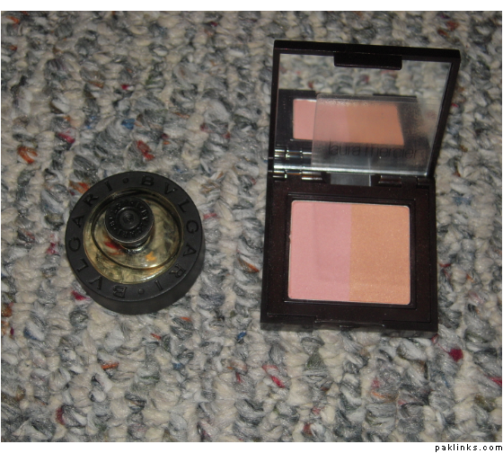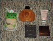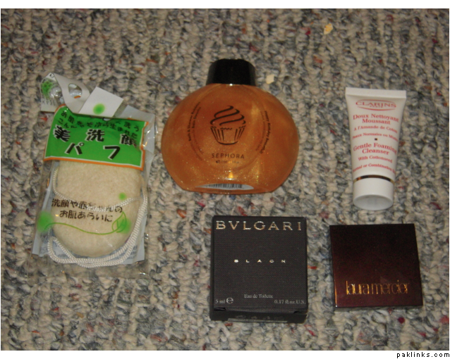 Random stuff: perfume, Laura Mercier blush/bronzer duo, a shower gel from Sephora and a Konjac sponge for cleansing.
