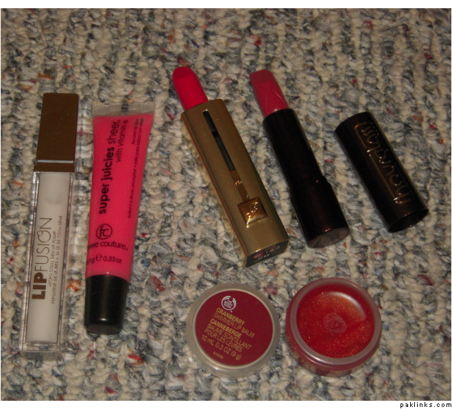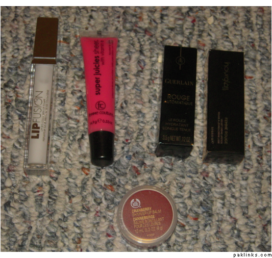 LipFusion gloss, Femme Couture gloss, Guerlain Chamade and Hourglass Fresco. (I’m in LOVE with these 2 lippes). Oh and there is also a lip balm from The Body Shop.
