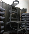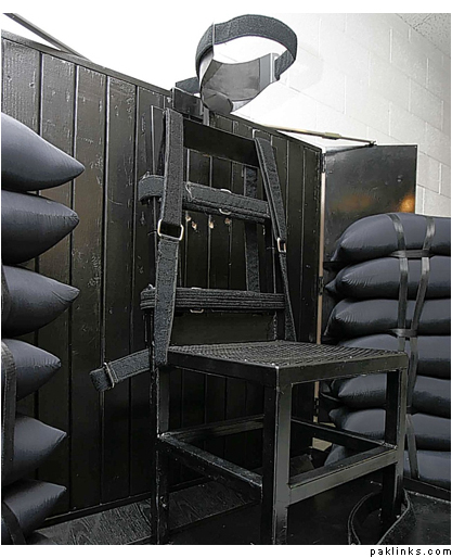 Target: the chair where Ronnie Lee Gardner died. Bullet holes can be seen in the wood panelling behind