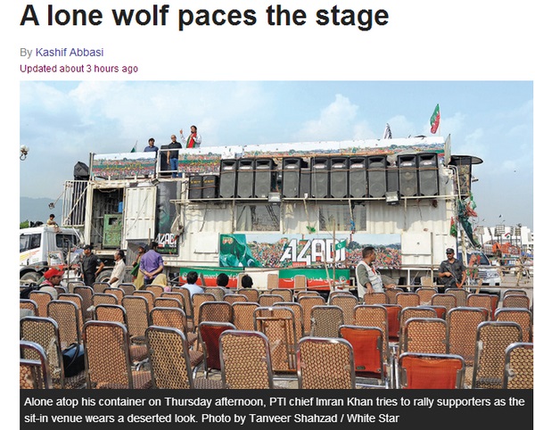 Imran still has a chance to rejuvenate himself...he can come on his container and announce that for sake of my country, i am temporarily compromising on PM resignation demand and is accepting a supreme court judicial commission for rigging investigations backed by army. If rigging is proved, Nawaz will have to resign and new elections will be announced.