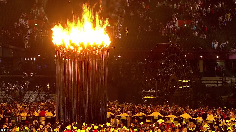 The Olympic Cauldron burns, lit by seven young athletes, chosen for their promise by British sporting legends