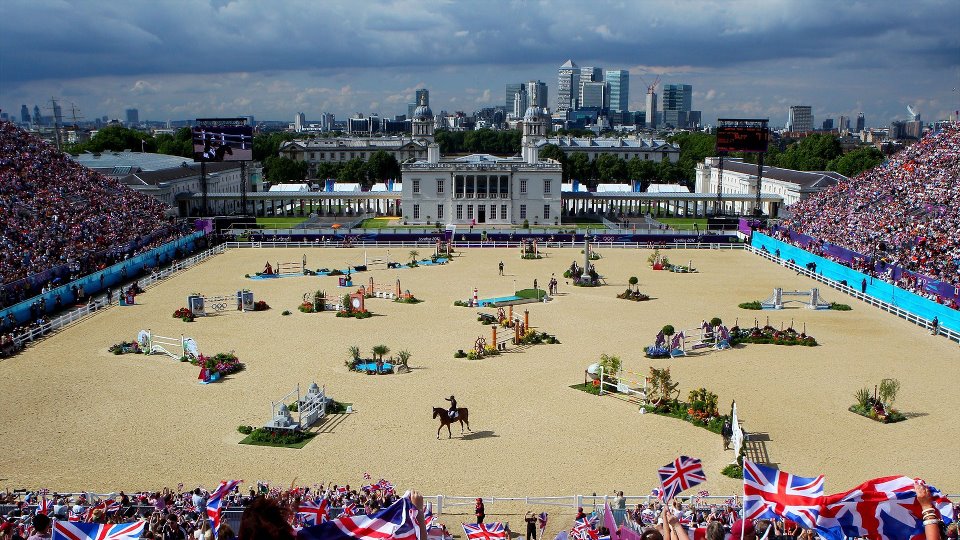 The Duke and Duchess of Cambridge cheer Zara Phillips she enters the arena during the Cross Country phase of the Eventing at Greenwich Park on the third day of the London 2012 Olympics, 30 July 2012. Their Royal Highnesses are Official Ambassadors of the Games.