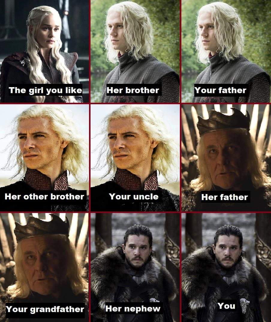But you are right about one of Jon/Daenerys surviving in the end. But its not for the shame cuz its GoT lol, cuz remember even what they didnt show here, Targeryns had the custom of siblings marrying either way even before the mad king.
