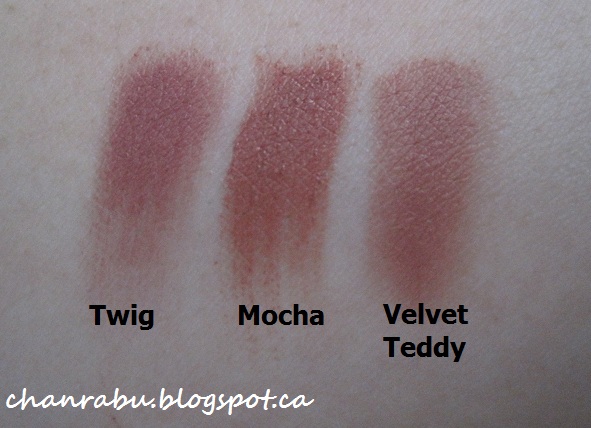 Twig is browner/more mauve. Personally i think velvet teddy is overrated and Twig is much nicer.