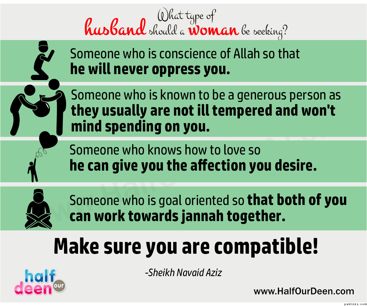 4- Someone who is goal oriented so that both of you can work towards jannah together. 5- Make sure you are compatible!