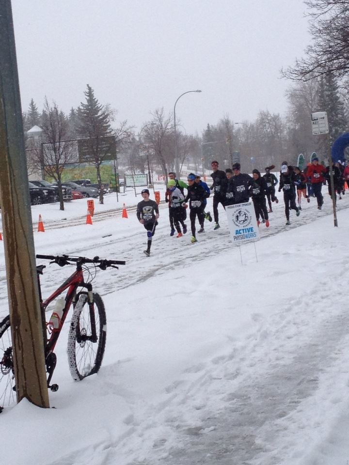 He surprised me completed at 57 minutes, older athlete was 48 mins, Coach was 53 minutes and Evan was 51 minutes. Evans dad is doing triathalon in Canmore. Learnt a good lesson in parenting, the brown girls were whinning about running in a blizzard and John simply walked away, no arguments.