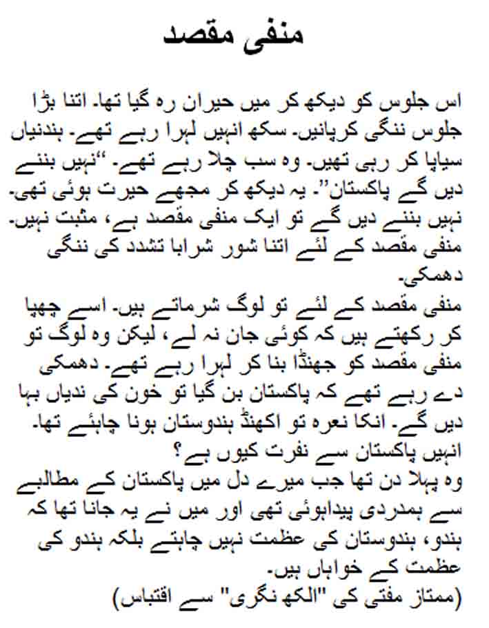 منفی مقصد کے لئے تو لوگ شرماتے ہیں۔ اسے چھپا کر رکھتے ہیں کہ کوئی جان نہ لے، لیکن وہ لوگ تو منفی مقصد کو جھنڈا بنا کر لہرا رہے تھے۔ دھمکی دے رہے تھے کہ پاکستان بن گیا تو خون کی ندیاں بہا دیں گے۔ انکا نعرہ تو اکھنڈ ہندوستان ہونا چاہئے تھا۔ انہیں پاکستان سے نفرت کیوں ہے؟