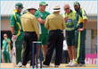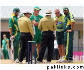 i wonder what this is about. smith and bob on the field with umpires and inzi.. surely its not the toss as smith is not padded up and the other batsmen can be seen padded up.