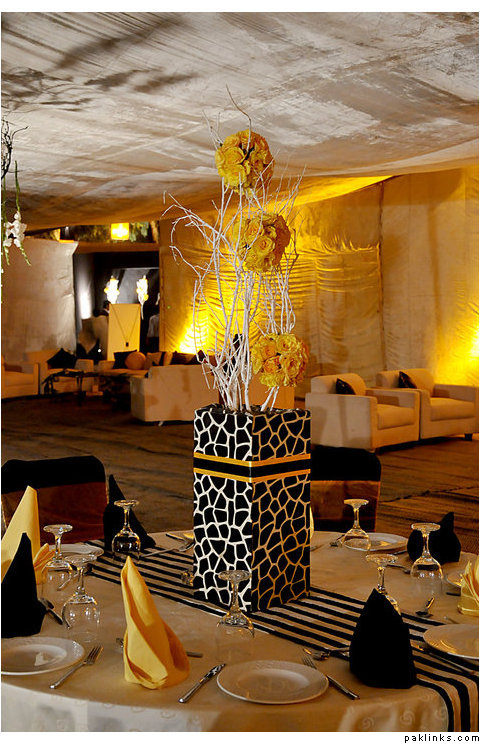 black and white damask, hot pink and yellow mehendi decor from sara baig designs: